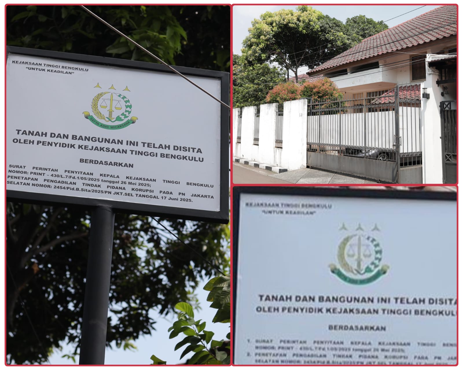 Kajati Bengkulu Victor Antonius Saragih Sidabutar melalui Kasi Penkum Kejati Bengkulu, Ristianti Andriani didampingi Kasi Penyidikan Kejati Bengkulu Danang Prasetyo, mengatakan penyitaan dan pemasangan plang dilakukan oleh Kejati Bengkulu berdasarkan penetapan Nomor 2454/Pid.B.Sita/2025/PN JKT.SEL dengan ditandatangani oleh Wakil Ketua Pengadilan Jakarta Selatan, Mashuri Effendie dan surat perintah penyitaan Kepala Kejaksaan Tinggi Bengkulu Nomor PRINT – 430/L.7/Fd.1/05/2025.