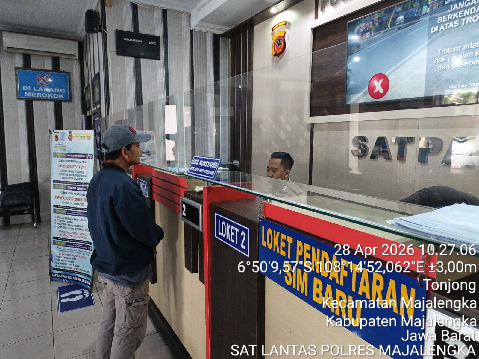 MAJALENGKA, HR — Satuan Lalu Lintas (Satlantas) Polres Majalengka terus meningkatkan pelayanan publik, khususnya dalam penerbitan Surat Izin Mengemudi (SIM). Pada Selasa (28/4/2026), petugas memberikan layanan pembuatan SIM baru dan perpanjangan di Kantor Satpas Polres Majalengka.